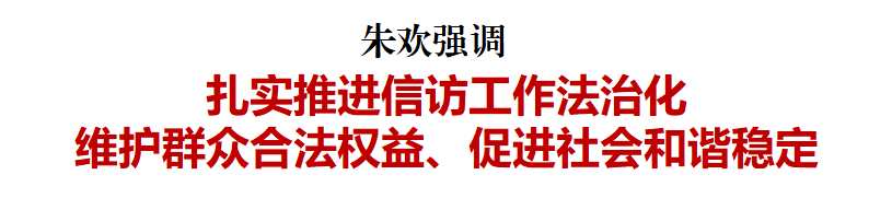 在听取全市信访工作情况及下一步工作打算后,朱欢强调,信访工作是了解社情民意的重要窗口。要切实提高政治站位,深刻认识信访工作的极端重要性,牢固树立守土有责、守土尽责的担当意识,以高度的责任感和使命感做好信访工作。要立足岗位职责扎实履职,积极与上级部门沟通对接,营造上下协同、合力攻坚的良好工作氛围。要始终绷紧信访维稳这根弦,健全完善信访信息报送机制,确保信访信息传递及时、准确、畅通。要夯实基层基础,用心用情开展工作,强化源头预防和治理,把潜在的矛盾纠纷消除在萌芽状态。要坚持“两手抓、两手硬”,精准把握工作方向和尺度,耐心细致做好政策解释和思想疏导工作,坚守法律底线和政策红线,引导群众理性表达诉求,依法解决相关问题,确保社会和谐稳定。